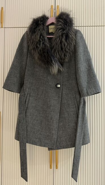 Zərif qadın palto, 500manata alınıb - Rəng: açıq boz/bej tonlarında, xırda teksturalı parça - Model: dizdən aşağı uzunluq, ikicərgəli düymə yerləri, yarı açıq/laçın yaxalı dizayn - Yaxa: çıxarıla b...