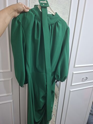 Yaşıl rəngli qadın paltarı - Model: qısa, A-kəsim, dizə yaxın uzunluq - Yaxası: yığma, dairəvi - Qol: qısa, həcimli puff qol - Kəmər: eyni materialdan, metal iki halqalı tokalı - Material: yüngül,...