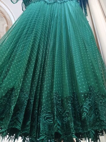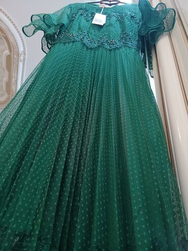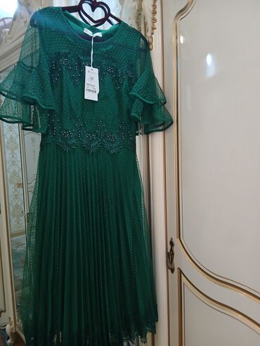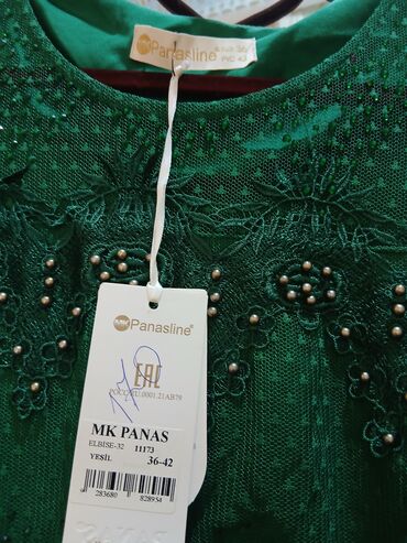 Brend etiketləri üzərindədir. Dizaynı yüngül, dalğalanan etek və incə bəzəklərlə qadınsı görünüş yaradır.