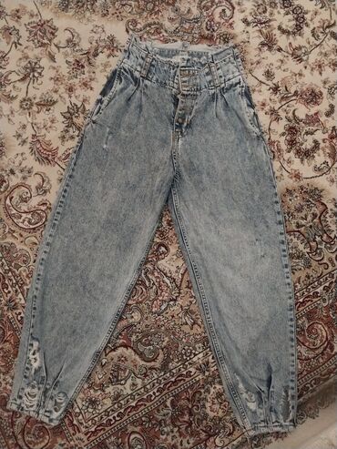 - Model: Yüksək belli, düz kəsimli “mom fit” cins şalvar - Rəng: Açıq mavi (light wash) - Material: 100% denim (pambıq əsaslı) - Dizayn: Ön və arxa hissələrdə qəsdən cırıq/dağınıq effektli rip‑and‑...