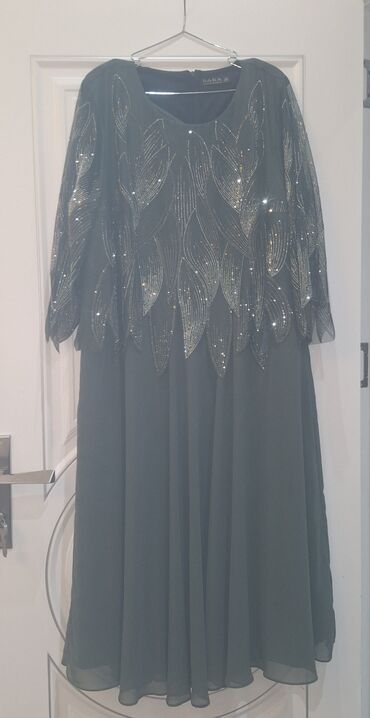 - Üst örtü (bolero ponço): eyni tonlarda nazik tor/şifon qat, geniş və rahat kəsim. Bütün ön və qol hissələrində yarpaq motivli sıx mikro-daş naxışları, işıqda parıltılı effekt verir. Donun üzərində asanlıqla geyinilir və çıxarılır.