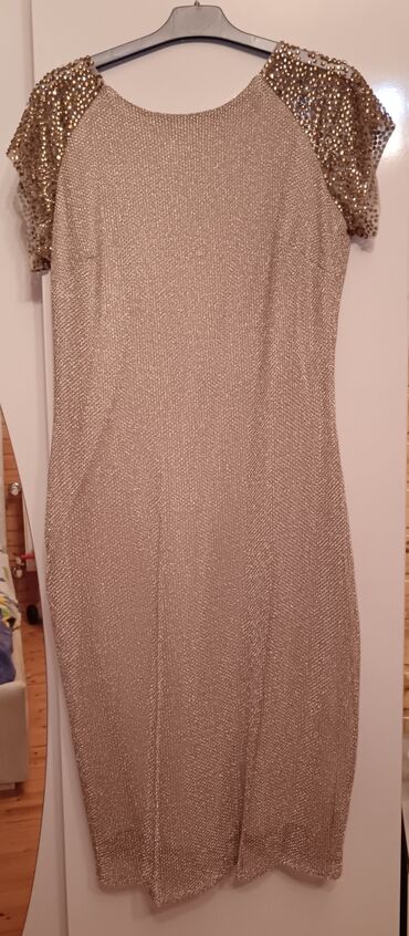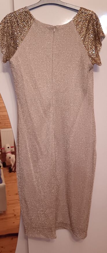 Zərif ziyafət/libas paltarı - Rəng: metalik qızılı – işıq altında parıltılı effekt verir - Parça: nazik, yüngül və axıcı, şimmerli tekstura - Model: uzun, geniş ətəkli (A-kəsimə yaxın), beldən büz...