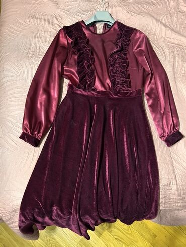Şık ziyafət və gündəlik paltar dəsti 1) Tünd bənövşəyi kokteyl paltarı - Brend: Joy-Phreen - Dizayn: Ön hissədə boydan-boya qat-qat volan detalları - Yaxa: dairəvi - Qol: ərkəksiz (sleeveless) - B...