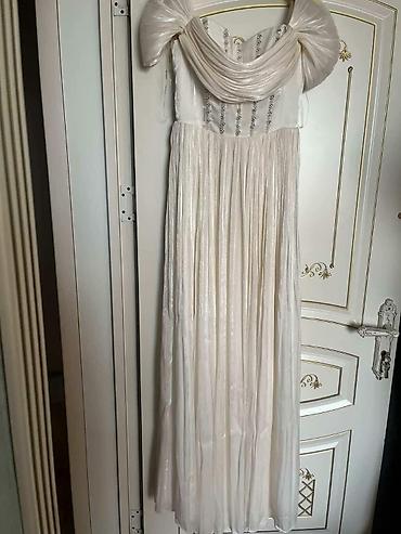 Zərif axşam/gecə geyimi – krem/ağ rəngdə, uzun, axıcı siluet.