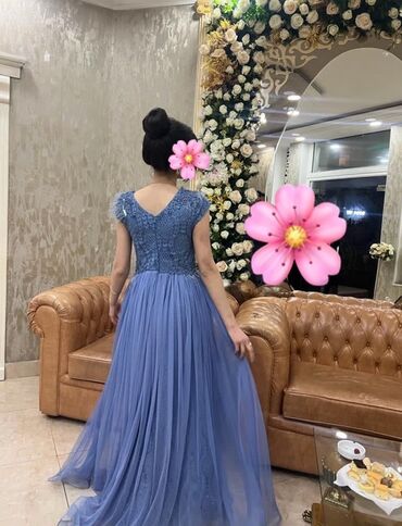 Mavi rəngli, qısaqol, V-yaxa ziyafət donu. Donun ətəyi tül qatlıdır və dizdən aşağı uzanır. Üst hissəsi incə naxışlı, krujeva detallı parçadan hazırlanmışdır. Qapalı kürək hissəsi və qısa qolları ilə zərif görünüş təmin edir. Mükəmməl rəngi və zərif dizaynı ilə xüsusi günlər üçün ideal seçimdir.