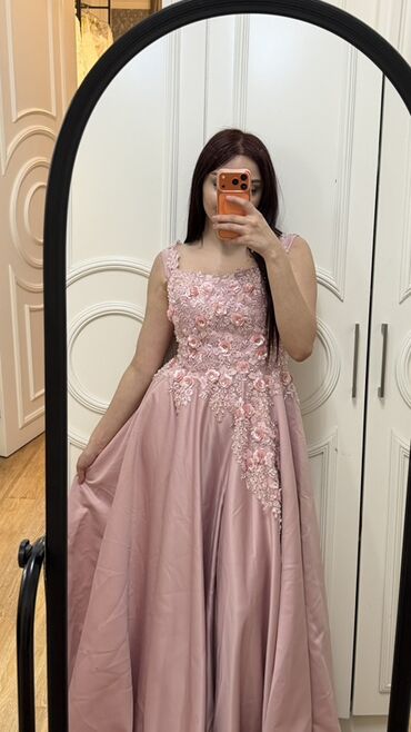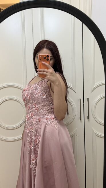 Solğun çəhrayı rəngdə, uzun ziyafət/libas geyim.