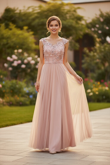 Zərif ziyafət/libas - Rəng: toz-çəhrayı (lilac tonlarında) - Model: uzun, A-kəsimli, yüngül flarlı ətək - Parça: şəffaf tül üst qat, incə romb naxışlı; altlıqla birlikdə - Yaxa: V-kəsim - Qol: 3/4...
