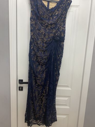 - Axşam geyimi: tünd göy rəngdə uzun ziyafət donu. Üstü tam krujeva (dəniz mavisi), içlik açıq bej rənglidir; iki qatlı görünüş verir. Asimmetrik drapeli bel hissəsində krujeva çiçək aplikasiyası və tül büzgü detalları. Qoluzun, yüngül “V” dekolte; zərif siluet və mərasimlər üçün uyğundur. Uzunluq: ayaqüstü (maxi).