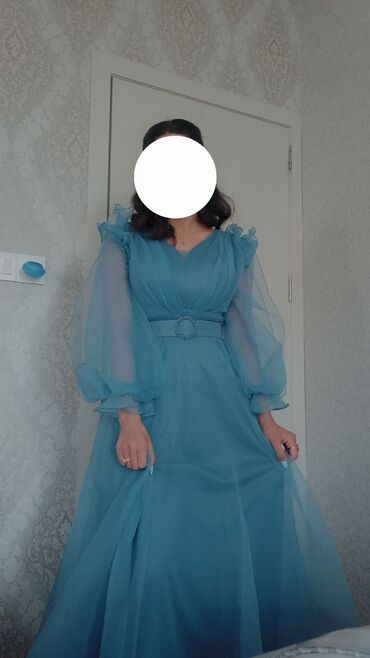tikdirlib 1 defe geyinilib - Model: Maksimum uzunluqda, axıcı kəsim - Rəng: Tünd/mid mavi - Parça: Yüngül, şəffaf üst qatlı (şifon effekti), astarlı - Yaxa: Dairəvi - Qol: Uzun, geniş axan qol fo...