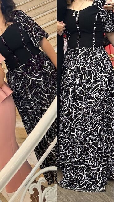 - Ətək: tam uzun, geniş kəsim; qara fonda ağ abstrakt xətlər