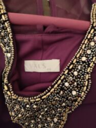Bənövşəyi rəngdə ziyafət/gecə geyimi. - Üst hissəsi şəffaf tül materialdan, sinə və çiyin hissələrində əl işi aplikasiyalar. - Bədənin ön və qol hissələrində bənövşəyi daş və muncuqlarla zəngin bə...