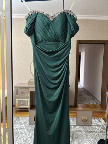 Zümrüd-yaşıl rəngdə zərif ziyafət/libas - Parça: atlas effekti verən parıltılı, axıcı material - Model: bədənə oturan, yanlardan asimmetrik drapeli, ön hissədə yüngül yarıq - Üst hissə: qollu dizay...