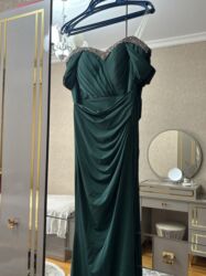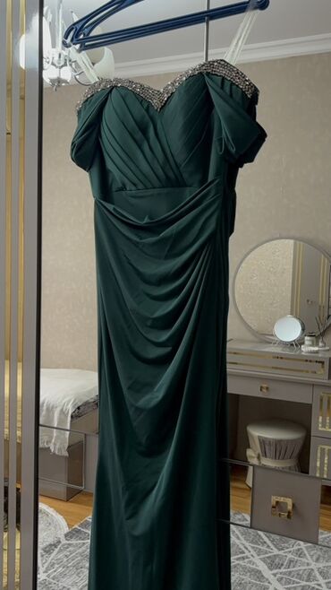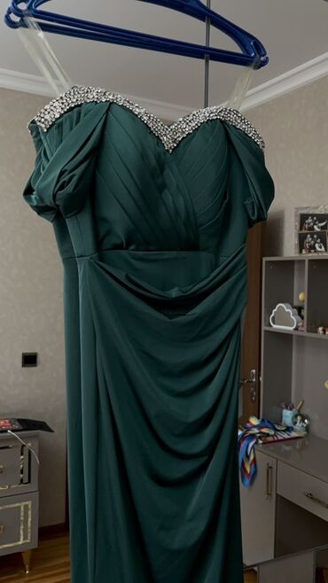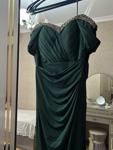 Tünd yaşıl rəngli ziyafət/libas - Model: Uzun, bədənə oturan siluet - Parça: Yüngül, parıltısız atlas effekti olan hamar toxuma - Dizayn detallar: - Qayıq formalı, yüngül drapeli dekolte - Yan...