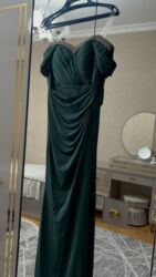 Toy, nişan, məzuniyyət və rəsmi tədbirlər üçün ideal, zərif və diqqətçəkən görünüş yaradır. Rəng: tünd zümrüd yaşıl. Stil: balıq siluetinə yaxın, drapeli, büstiyer tipli üst. Material: axıcı, yumşaq parça (vizual olaraq atlas/saten effektli).