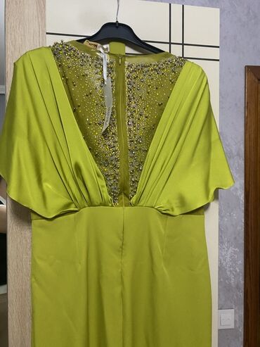 Yasəmən-yaşıl rəngdə, zərif axıcı fakturalı ziyafət paltarı. - İnce, tənzimlənə bilən spagetti askılar - Büst hissəsində dərin V kəsim və büzgülü dizayn - Dekolte xəttində iri şüşə/kristal daş a...