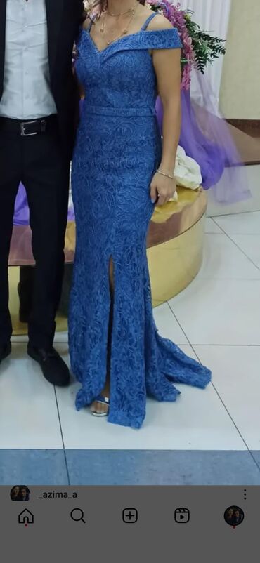 Mavi rəngli uzun ziyafət geyimi - Model: off-shoulder (çiyinlər açıq), büst hissəsində incə krujeva zolağı - Kəsim: bədənə oturan siluet, ön hissədə yarıq, arxaya doğru yüngül quyruq effekti - Par...