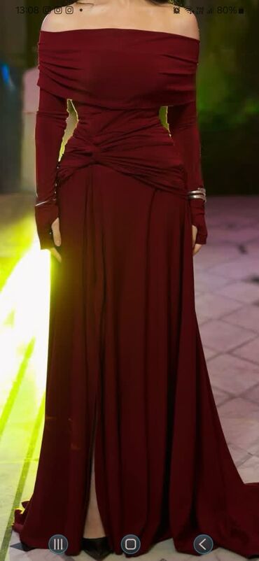 Qırmızı-bordo rəngdə zərif ziyafət/libas - Uzun, yerə qədər model - Çiyinlərə düşən qipir/naxışlı qollar - Yarı balıq siluetli ətək, yandan yüngül ətək açıqlığı - Bel xəttini vurğulayan nazik deko...