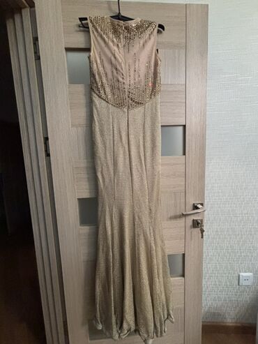 Zərif gecə/geyim üçün uzun don - Rəng: açıq şampan/solğun qızılı - Parça: atlas effekti ilə parlaq, axıcı material - Üst hissə: straplez korsaj, tamamı xırda daş və muncuq aplikasiyaları ilə işlən...