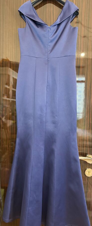 Bənövşəyi rəngdə, uzun, saten parçadan hazırlanmış qadın ziyafət donu.