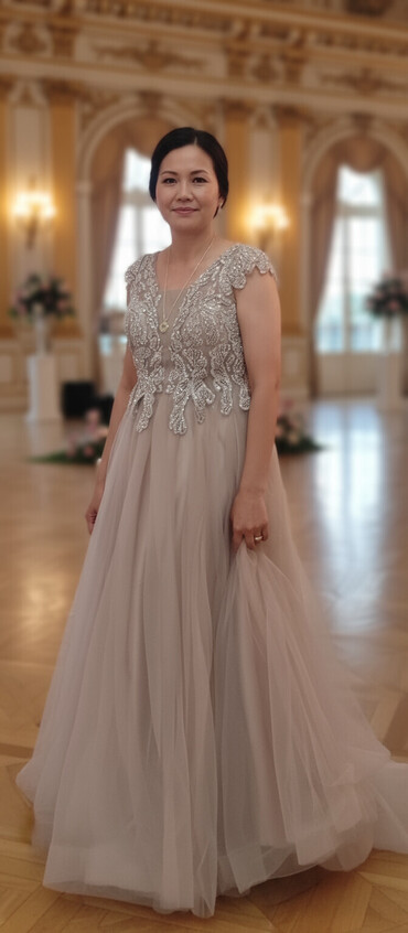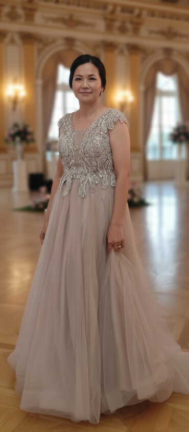 - Material: Yüngül tül qatları, üst hissədə sıx muncuq və payet aplikasiyaları