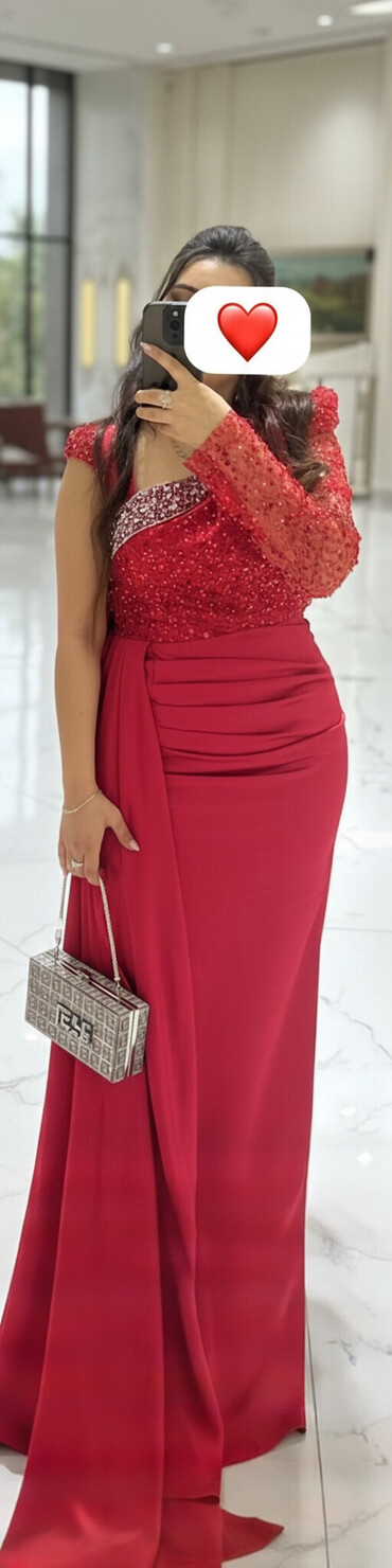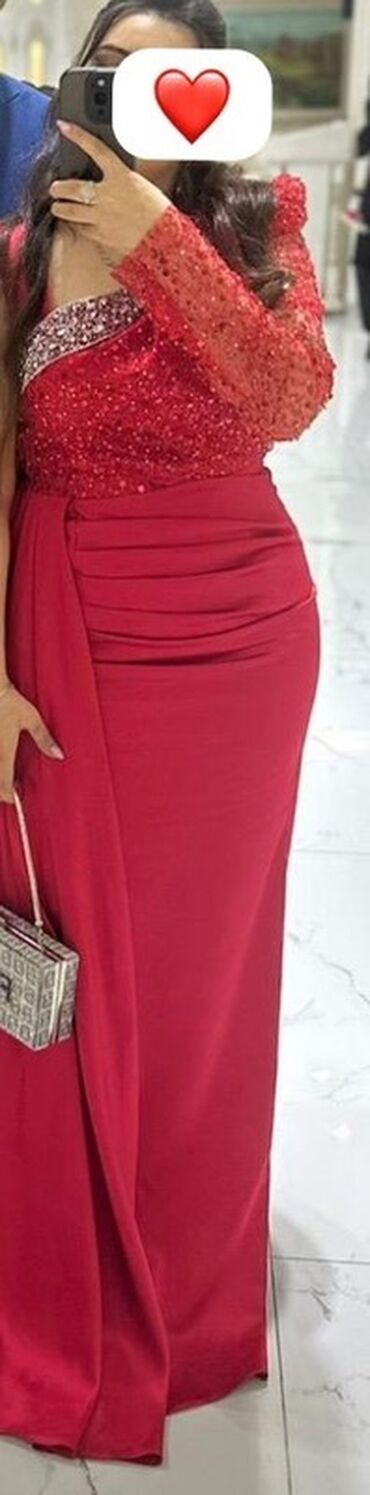 - Qırmızı, asimmetrik birqollu uzun don: Üst hissə daşlı/munçuqlu işləmə ilə, çiyindən aşağı enən drapeli pərdə effektli detal; beldə plise-drapelər, düz kəsim ətək, yerə qədər uzunluq. Parıltılı bənd və şifon-saten qarışığı faktura.