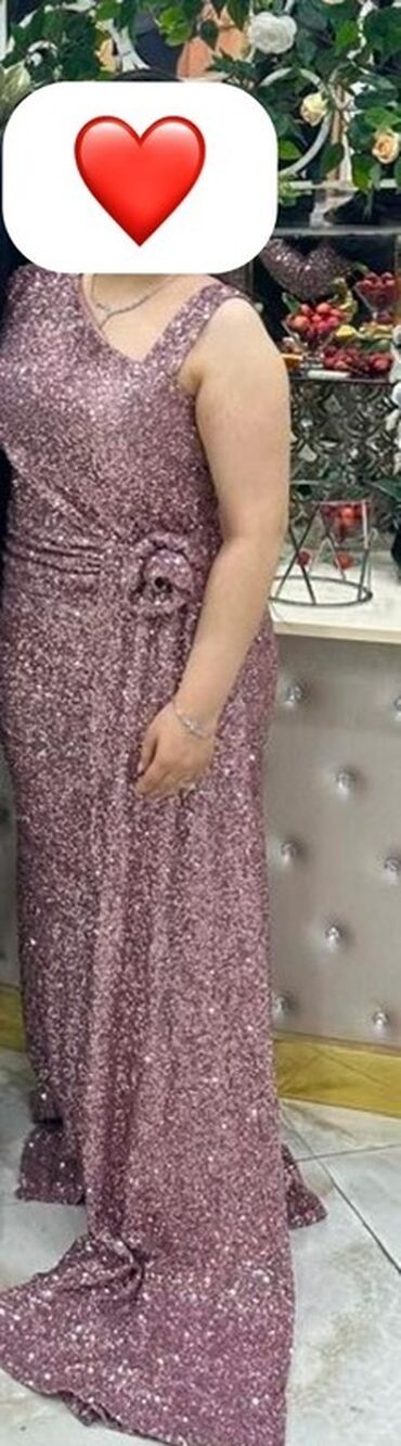 - Pudra-bənövşəyi (lilac) simli/payetli don: V-yaxa, qolsuz, tam səthdə sıx parıltılı payet örtüyü; beldə gül aplikasiyası və yüngül plise; balıq kəsimə yaxın, arxadan quyruqlu uzun ətək.