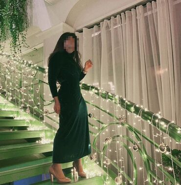 - Model 2: Tünd yaşıl rəngdə, yumşaq, azacıq parıltılı məxmər effektli parça. Uzun qollu, baldırdan aşağı midi uzunluq. Bədənə yaxın kəsim, yüngül drapəli quruluş və minimalistik dizayn sayəsində şıq görünüş. Qadınsayağı silueti ön plana çıxarır. 25 azn