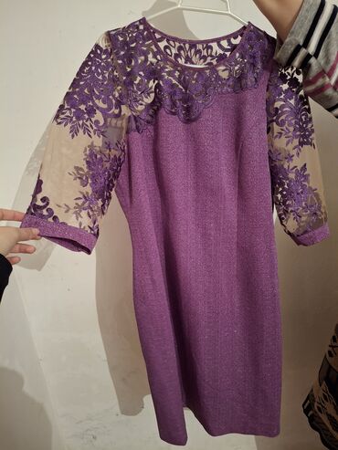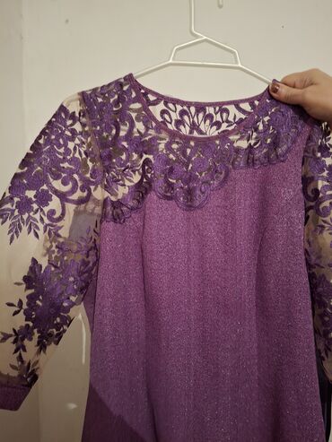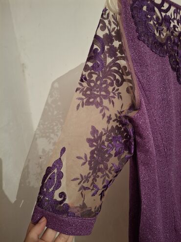 - Üst və qollar: Şəffaf tül üzərində bənövşəyi güllü krujeva işləmələr