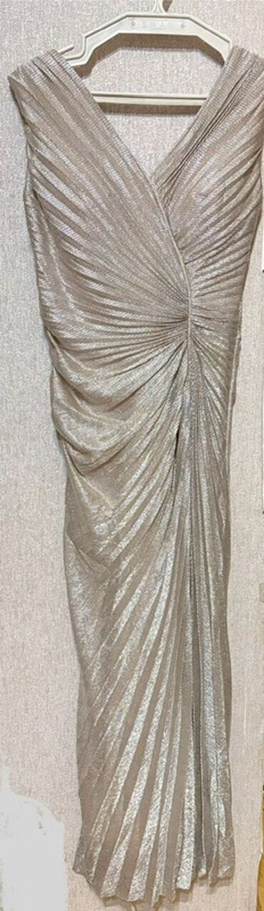 Parcasi Turkiyeden alinib tikilmedi 1defe geyinilib Qızılı metallic rəngdə ziyafət geyimi - Model: Uzun, bədənə oturan, asimmetrik drapeli şık gecə/libas - Rəng və faktura: Parlaq qızılı met...