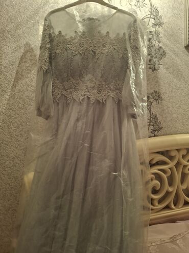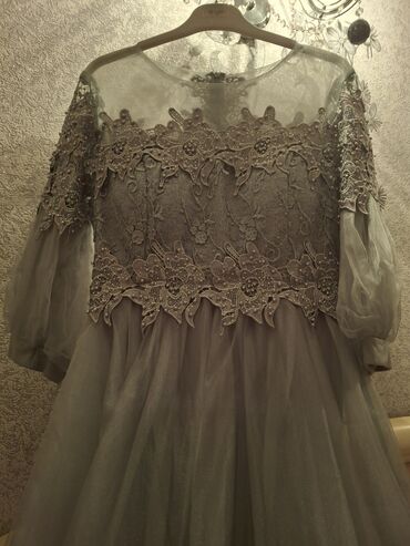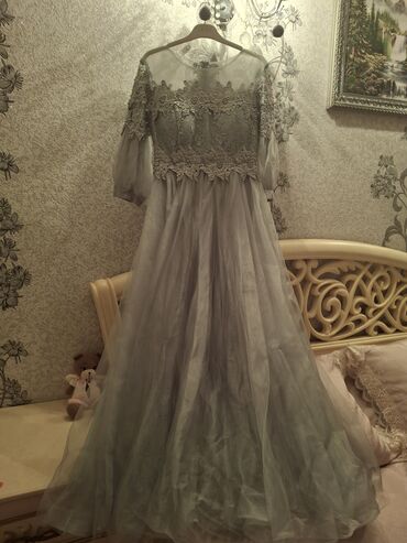 1dəfə geyinilib 800azn alınıb 450satiram Gümüşü-boz rəngdə, tam ətəkli ziyafət/libas - Parlaq payet və muncuq işləməli, naxışlı tül üstlük - Üst hissə şəffaf tül dekolte ilə, iç hissədə uyğun rəngl...