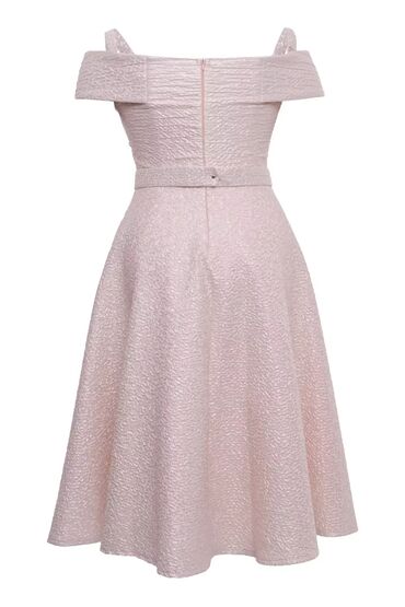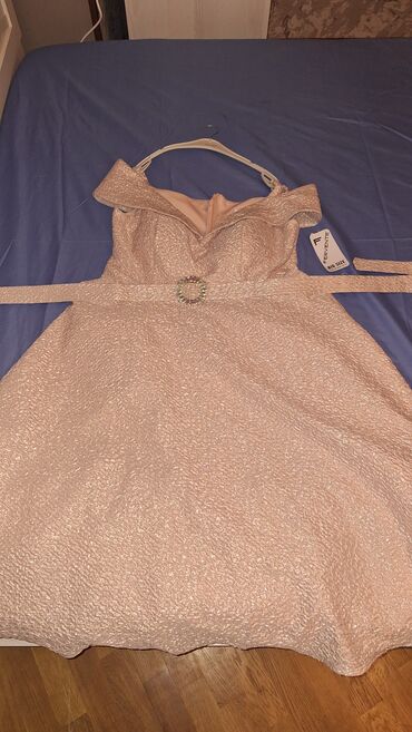 Sadə, zərif amma şık ziyafət/qonaqlıq paltarı. Açıq pudra rəngində, parıltılı teksturalı, yumşaq, həmçinin kəmərli.