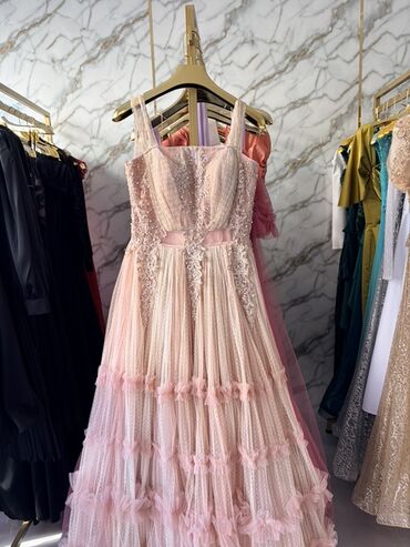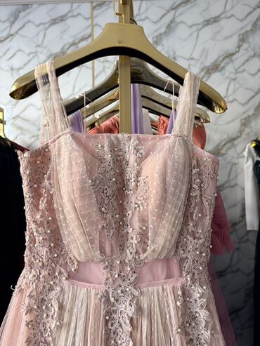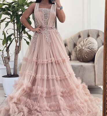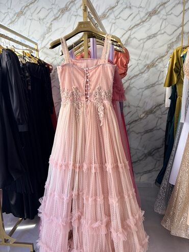 Zərif şifon və tüldə hazırlanmış uzun ziyafət/libas. Pudra-çəhrayı rəng palitrası, nöqtəli tül fakturası və çoxqatlı ətək hissəsi ilə romantik siluet yaradır.