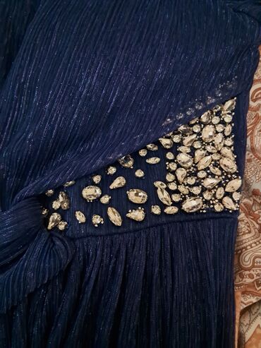 Mavi rəngli elegan gecə/ziyafət geyimi. 300 manata alınıb 1 defe geyinilib - Model: Uzun, asimmetrik drapeli dizayn. - Parça: İşıqda zərif parıltı verən, axıcı şifon qatlı material. - Üst bəzə...