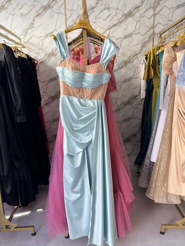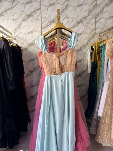 Məhsul: Zərif ziyafət/nişan/gecə geyimi - Rəng: Açıq mavi (pastel ton) - Model: Uzun, ətəyi bol axıcı kəsim - Parça: Yüngül, dalğalı düşüşlü şifon tipli ətək; üst hissə dekorativ parça ilə işlənmi...