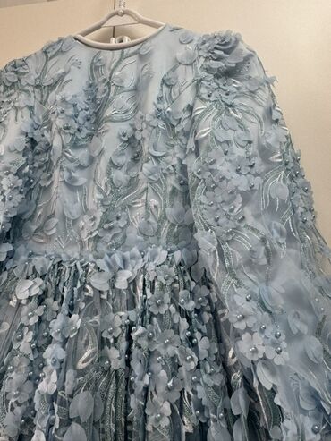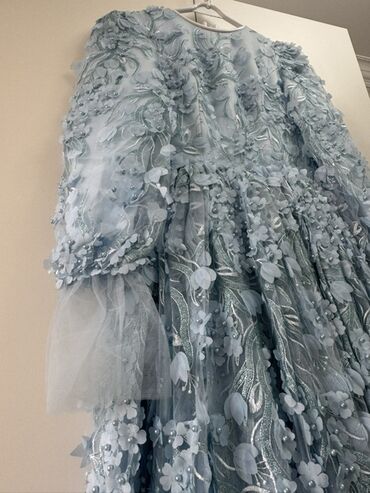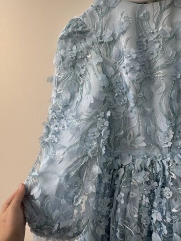 Zərif mavi rəngdə uzun ziyafət/gecə geyimi. - Modell: Asimmetrik dizaynlı – bir tərəfi sadə uzun qollu, digər tərəfi şəffaf tül və muncuq xətləri ilə bəzədilmiş, 3D gül aplikasiyaları ilə vurğulanm...