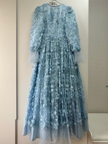 Məhsul: Zərif ziyafət/nişan/gecə geyimi - Rəng: Açıq mavi (pastel ton) - Model: Uzun, ətəyi bol axıcı kəsim - Parça: Yüngül, dalğalı düşüşlü şifon tipli ətək; üst hissə dekorativ parça ilə işlənmi...