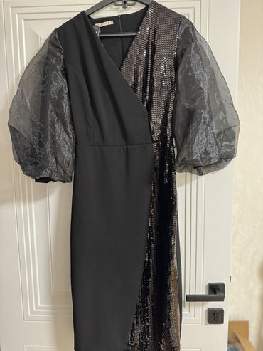 Məhsul: Qadın ziyafət geyimi - Rəng: Qara - Ölçü: XL (USA XL, MEX 42 etiketdə) - Dizayn: Asimmetrik kəsimli, bir tərəfi tam parıltılı payetli parçadan drapeli, digər tərəfi mat parça. V-yaxa, beld...