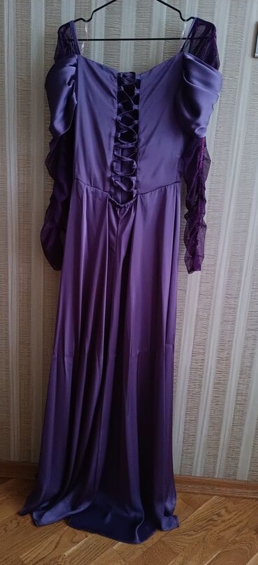Bənövşəyi rəngdə, uzun, saten parçadan hazırlanmış qadın ziyafət donu.