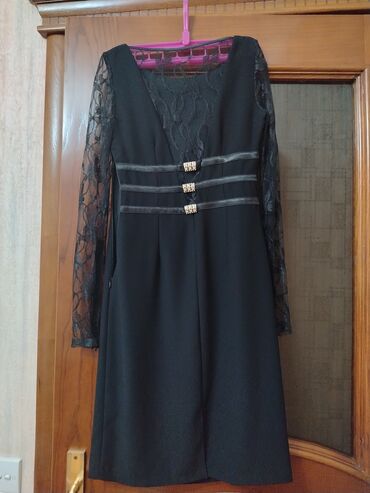 Qadın krujeva paltar - Rəng: qara - Material: tam krujeva üst qat, içəridə nazik astar - Dizayn: beldən yüngülcə açılan A-kəsim ətək - Yaxası: qapalı/yarım-balıqçı yaxa - Qol: uzun qol, dirs...