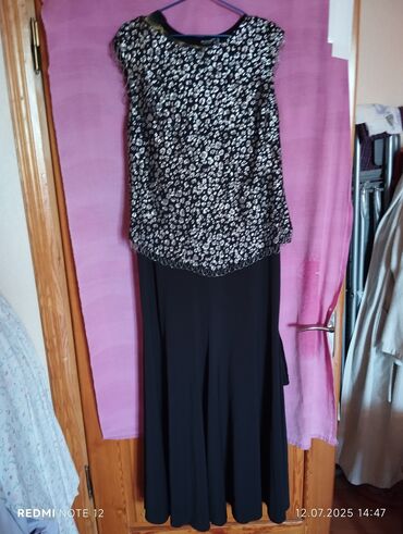 - Model: ikiqat görünüşlü paltar – üst hissə parlaq gümüşü leopard naxışlı, alt hissə isə uzun, qara, axıcı ətək.