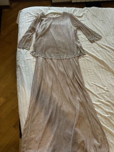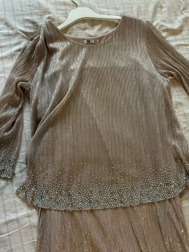 İki hissəli zərif ziyafət dəsti - Rəng: açıq bej/nude ton - Komplekt: üst (şifon-nazik tül) və ətək - Bəzək: üçölçülü appliqasiya güllər, yarpaq motivləri və incə muncuq işləmələri; naxışlar həm ö...