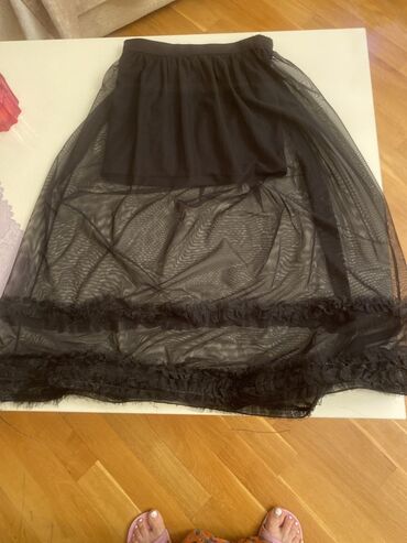 - Ətək: Qara tül midi/uzun ətək. Elastik bel, iç hissədə qısa qara astar, üstündə şəffaf tül qatları və aşağı hissədə büzməli dekorativ haşiyə. Topla birlikdə geyinildikdə paltar effekti yaradır.