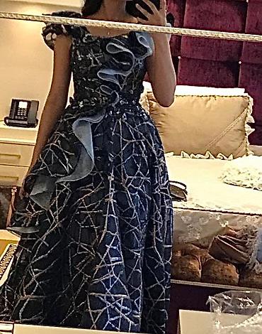 Zərif ziyafət/nişan/gecə geyimi – tünd göy rəngdə, metalik gümüş xətt naxışlı.