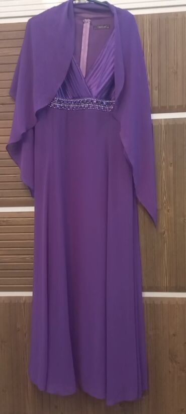 Brend: SAKA Model: Uzun ziyafət/abiyə don - Rəng: Dərin bənövşəyi - Kəsim: Uzun, düz siluet; dairəvi yaxa - Üst hissə: Asimmetrik tül pelerin. Pelerinin kənarları xırda daşlarla bəzədilib, sağ tər...