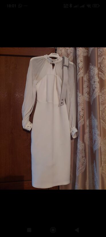 Yenidir etiketlidir Ağ rəngli zərif ziyafət/nişan donu - Model: axıcı şifon görünüşlü, A-kəsim, bel hissəsində drapajlı quruluş - Boy: midi–uzun (baldırdan aşağı) - Yaxa: V-yaxa ön hissə, arxadan...