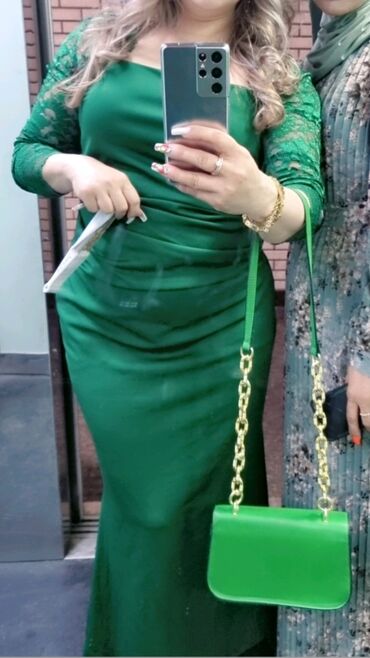 - Model 3: Zümrüd-yaşıl düz kəsimli ziyafət geyimi. Yuxarı hissə düz, beldə nazik drapeli formalar, 3/4 uzunluqda incə krujeva qollar. Eyni tonda zəncir saplı kiçik çiyin çantası ilə uyğunlaşdırılıb.