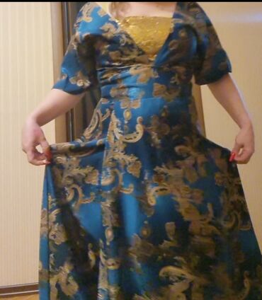 - Model 2: Firuzəyi-mavi atlas parça üzərində qızılı barokko naxışları. V-yaxalı, yarımqol, beldən oturan və ətəyi geniş açılan maxi uzunluq. Daxili hissədə parıltılı sarı bodi/korse detallı kombinasiya görünüşü.