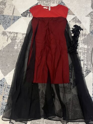 - Rəng: üst hissə qırmızı, ətək və yan panellər qara - Dizayn: qapalı yaxalı, qısa qollu siluet; qırmızı əsas parça üzərində şəffaf qara şifon qatlarla uzanan, zərif axıcı ətək - Detal: ayrıca qara aplikasiyalı bəzək elementi (floristik naxışlı) – kəmər və ya aksessuar kimi istifadə oluna bilər - Uzunluq: maxi - Arxa hissədə kiçik açılışlı bağlanma - Material: əsas parça yüngül, üst qatlar isə şəffaf şifon tipli - Stil: məclis, nişan, tədbir və axşam dəvətləri üçün uyğundur - Bədənə oturan yuxarı hissə, aşağıda genişlənən axıcı ətək, yandan şəffaf panellər qadınsı silueti vurğulayır