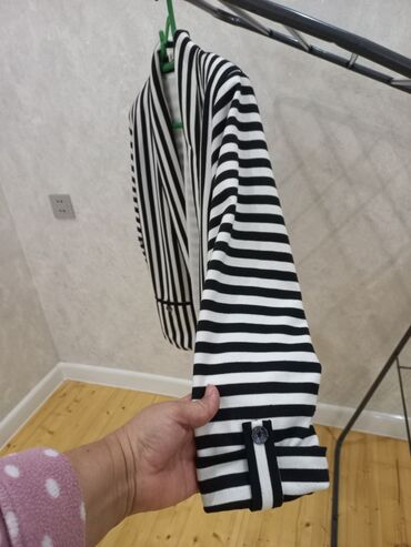 Qadınlar üçün qara klassik jaket - Rəng: saf qara - Kəsim: beldə yığcam, minimalistik düz siluet - Yaxa: dərin V-yaxa, düyməsiz/bağlantısız ön hissə - Qol: uzun qollar, manjetlər yüngül bükümlü - ...