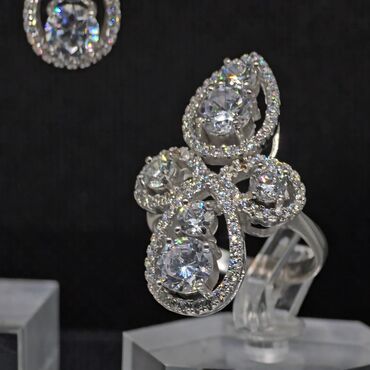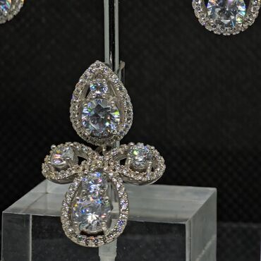 Zərif gümüş 925 bu zərgərlik dəsti sallanan sırğalar, üzük və kulon daxil olmaqla, damla və dairəvi formalı şəffaf daşlarla bəzədilmişdir. Hər bir detalda daşların ətrafında kiçik işıltılı daşlar mövcuddur. Bu dəst zərif görünüşü ilə hər hansı bir geyimə parıltı qatmaq üçün idealdır.